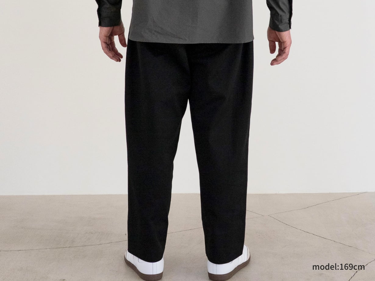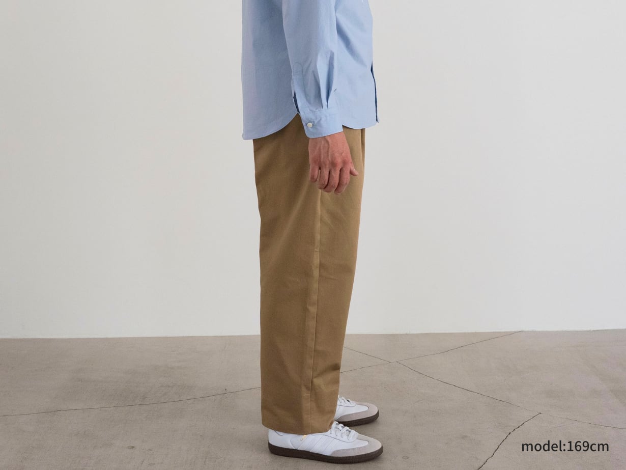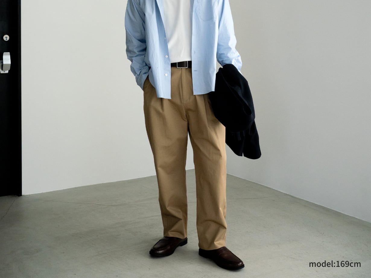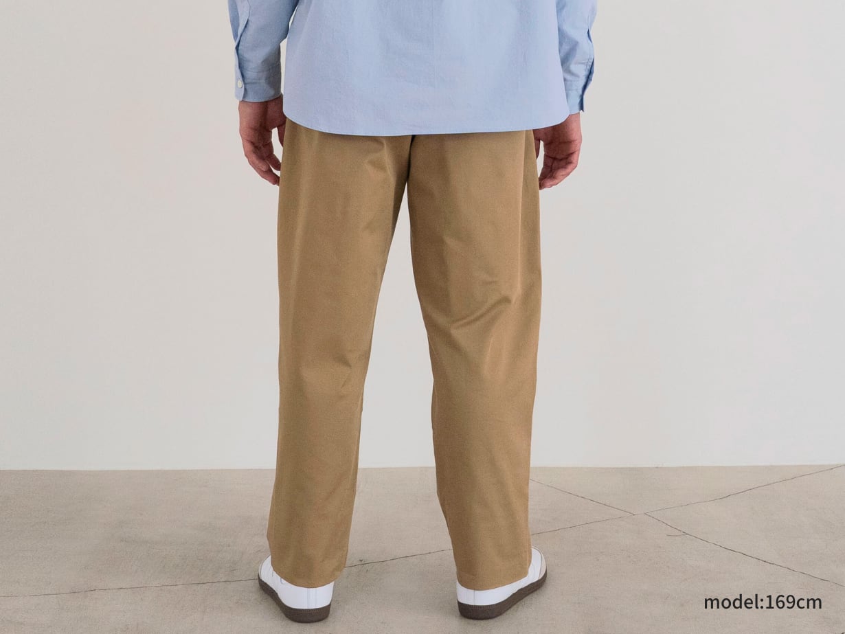 「チノパンはダボつくから似合わない」——そんな小柄男性の悩みを解決する一本です。カジュアルに着やすい定番アイテムでありながら、シルエットは脚がきれいに見えるテーパードを採用。裾も折りやすく、丈直しをしなくても自然なバランスに整えました。