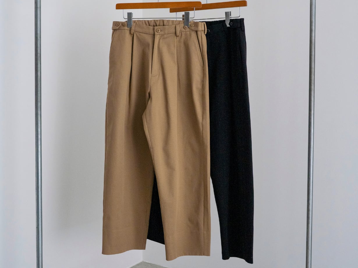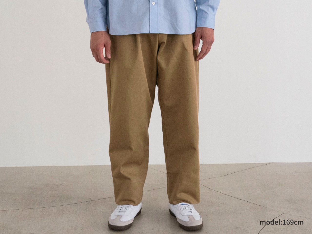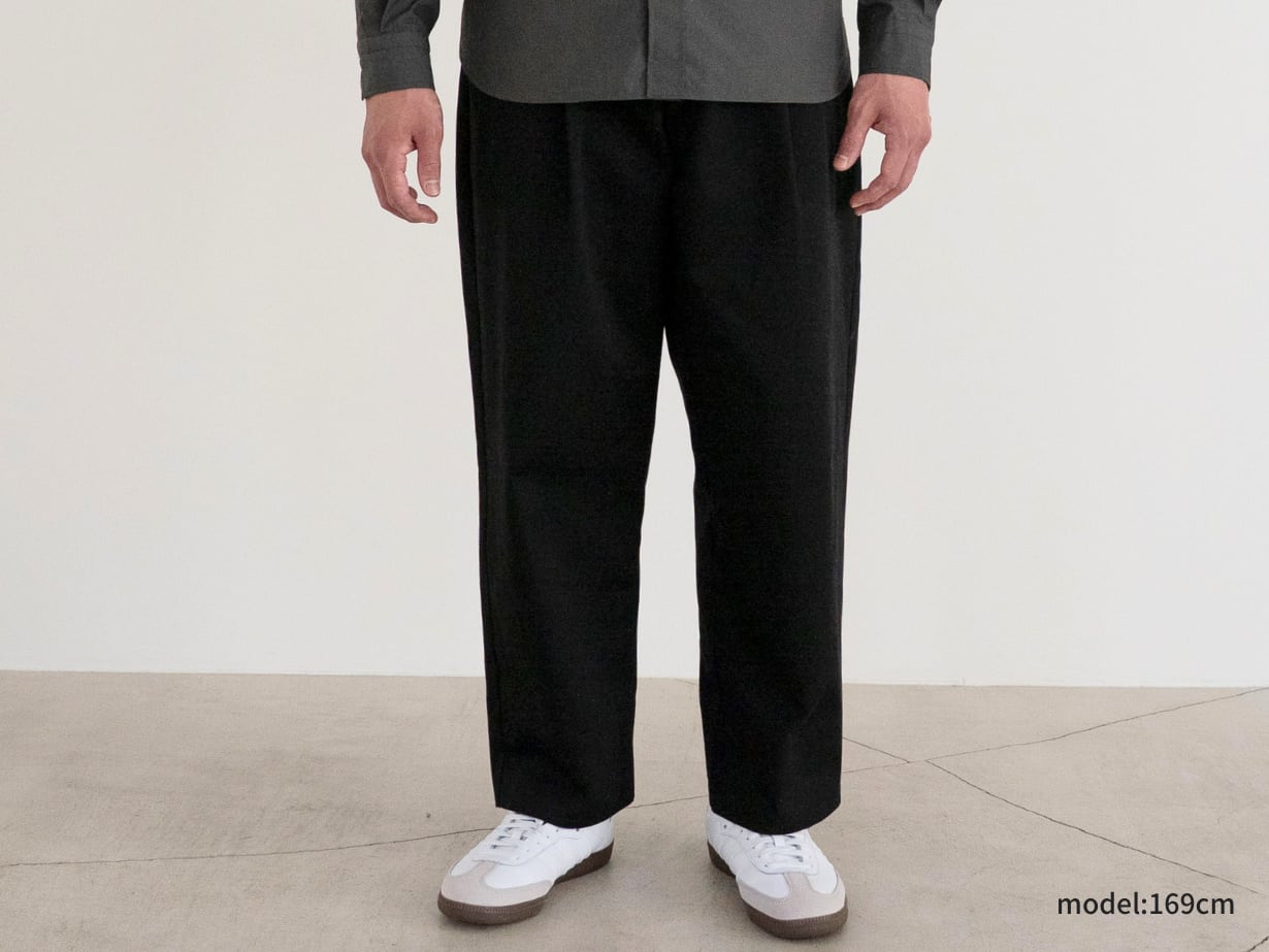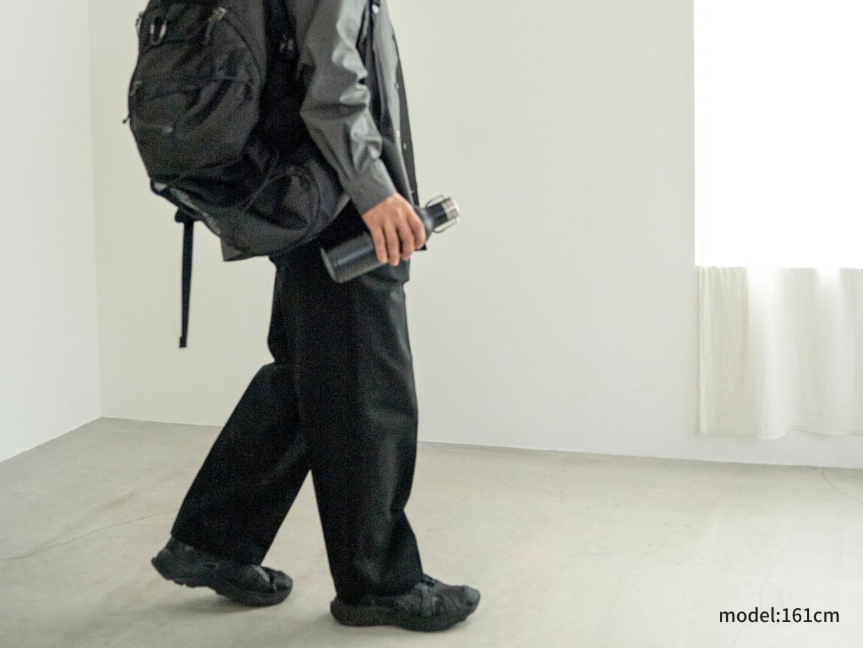 「チノパンはダボつくから似合わない」——そんな小柄男性の悩みを解決する一本です。カジュアルに着やすい定番アイテムでありながら、シルエットは脚がきれいに見えるテーパードを採用。裾も折りやすく、丈直しをしなくても自然なバランスに整えました。